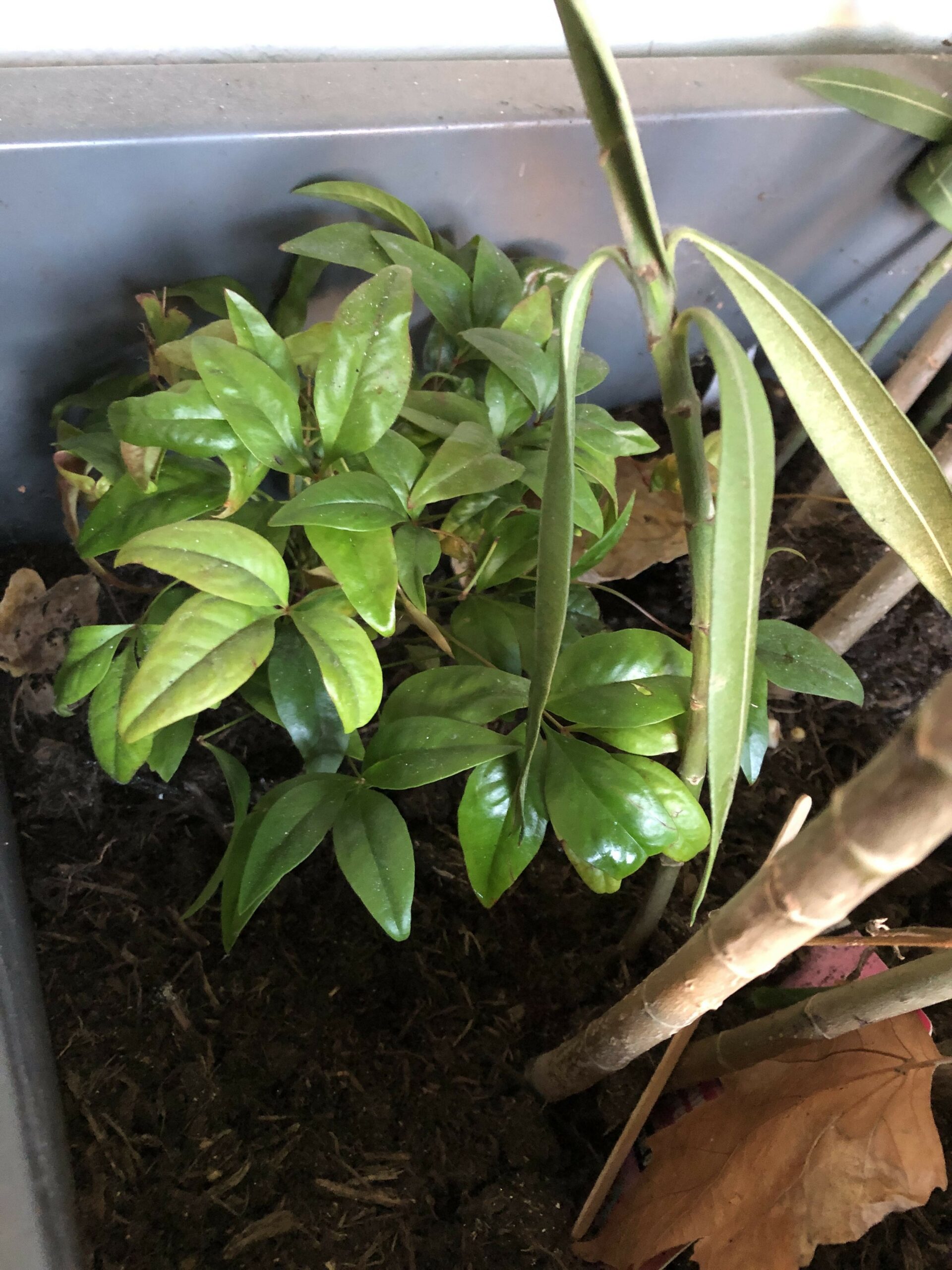 Dans un bac à fleurs du couloir du Café A un Nandina Fire power s’est blotti à côté d’autres plantes.